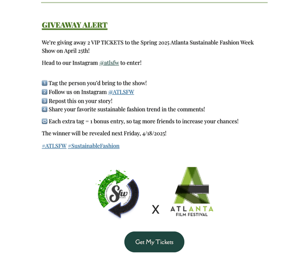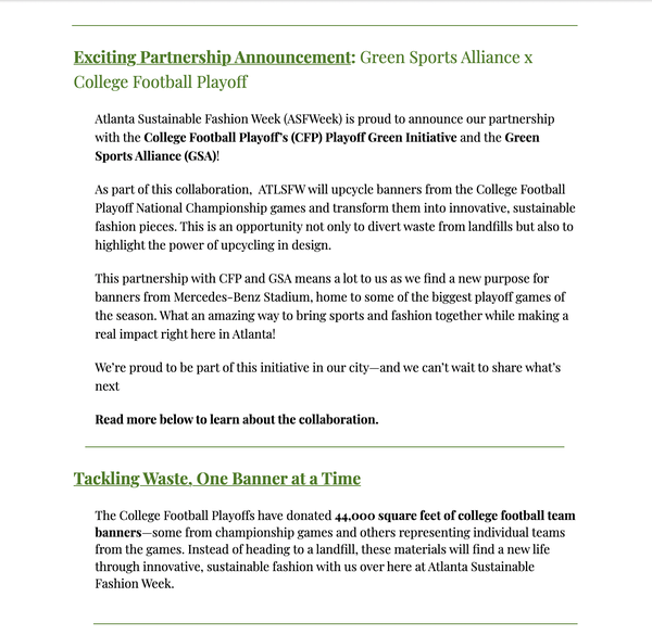 As part of my role with Atlanta Sustainable Fashion Week, I was responsible for managing and writing newsletters for ATLSFW. I wrote five newsletters communicating essential updates and sustainability education to an audience that may not be as active on social media but whose support was crucial to ATLSFW.