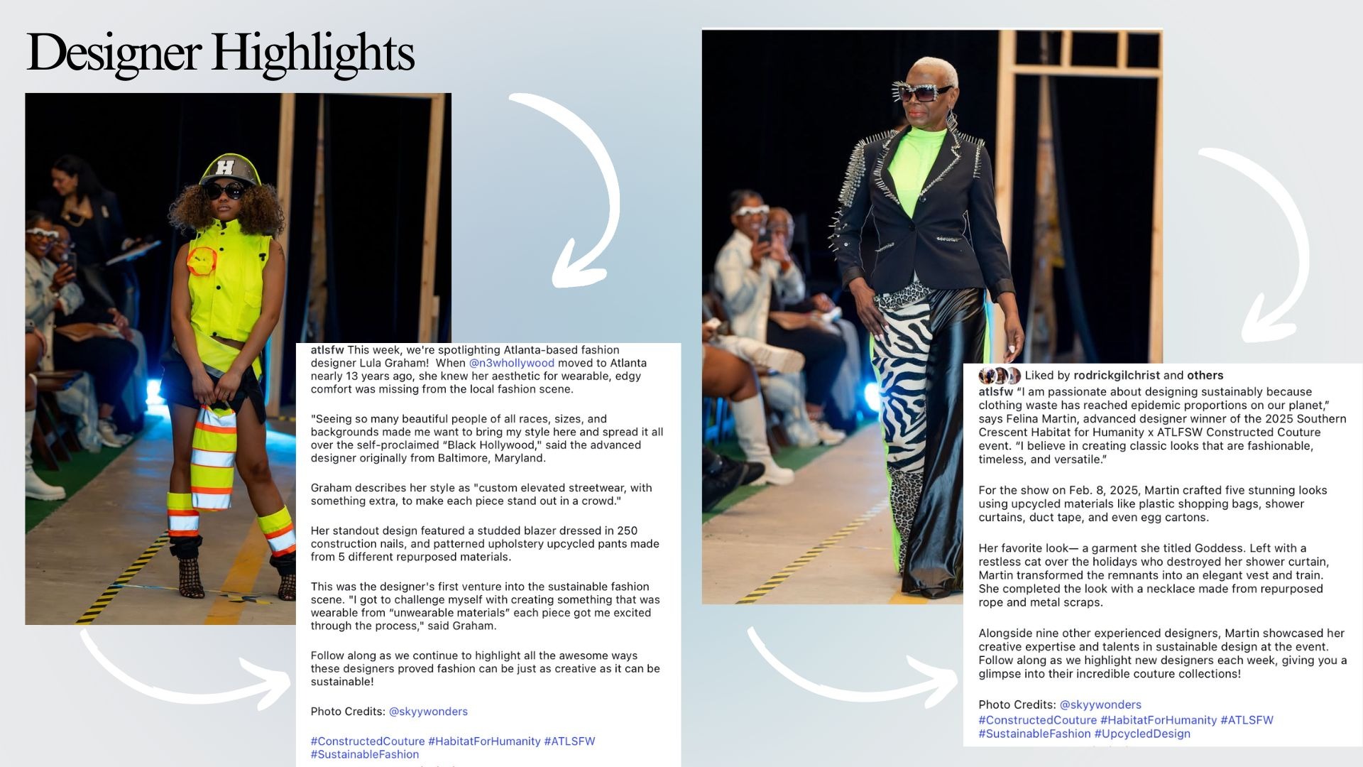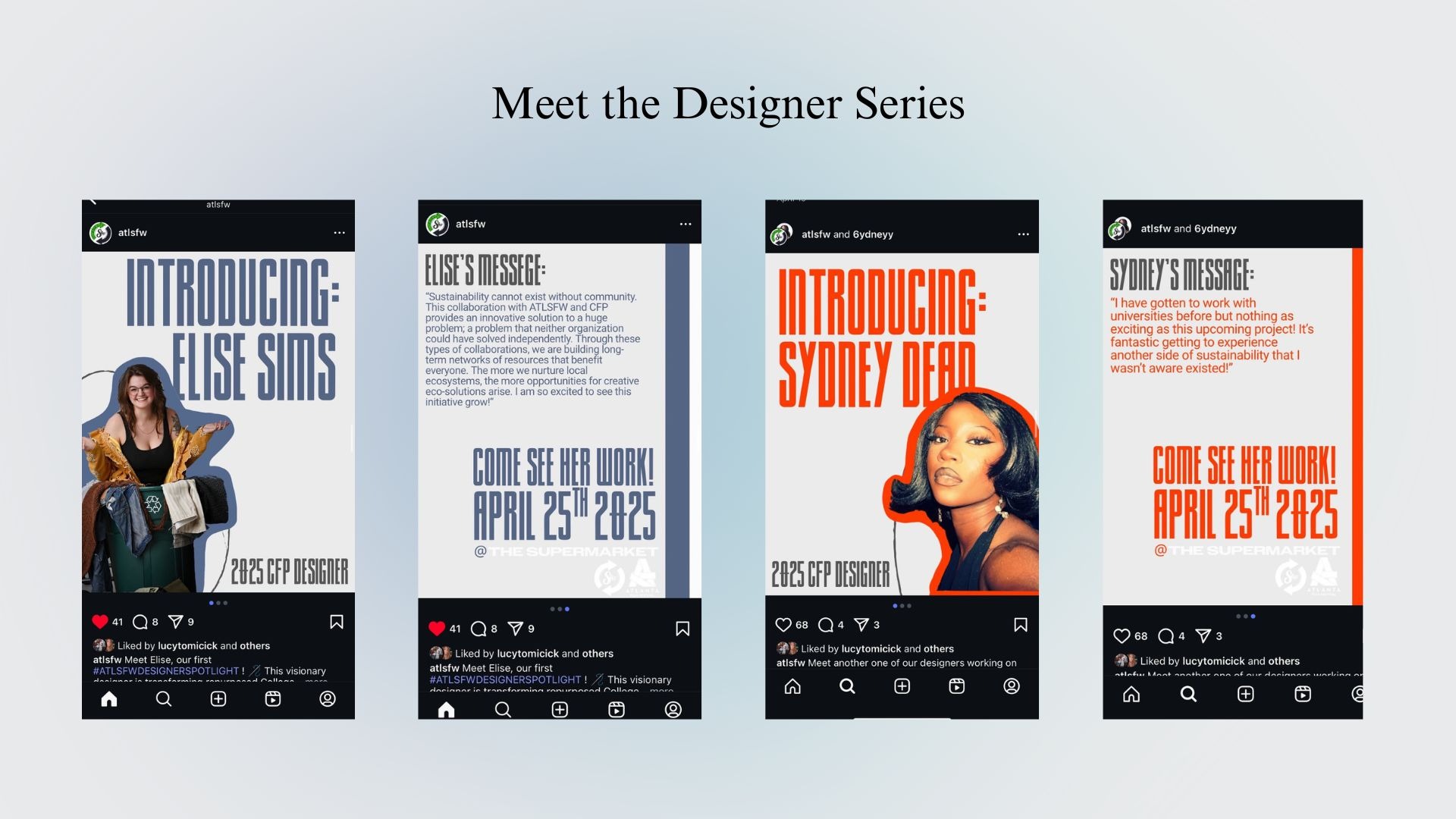 To make ATLSFW's social media presence more personal, I wanted followers to connect directly with the designers behind the shows. Personalizing the posts created excitement for upcoming events while also showcasing the designers' commitment to sustainability. Seeing faces and personalized posts in the feed encouraged engagement and helped increase traction across our social media accounts.