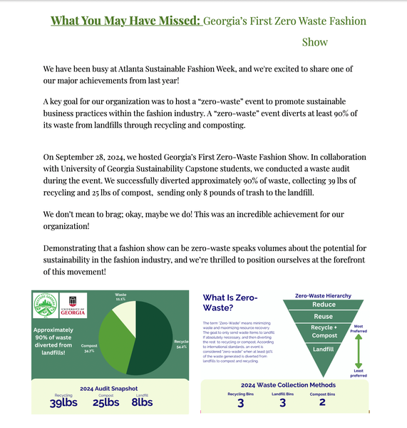 Celebrating Milestones: Worked to educate subscribers about the success of Georgia's first Zero-Waste Fashion Week in 2024, emphasizing its significance and impact.